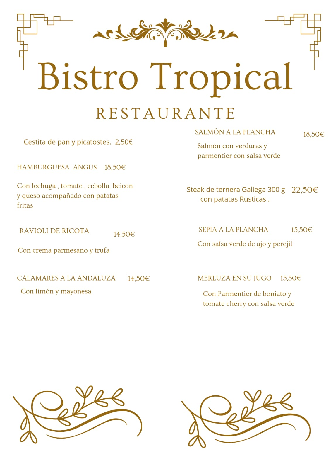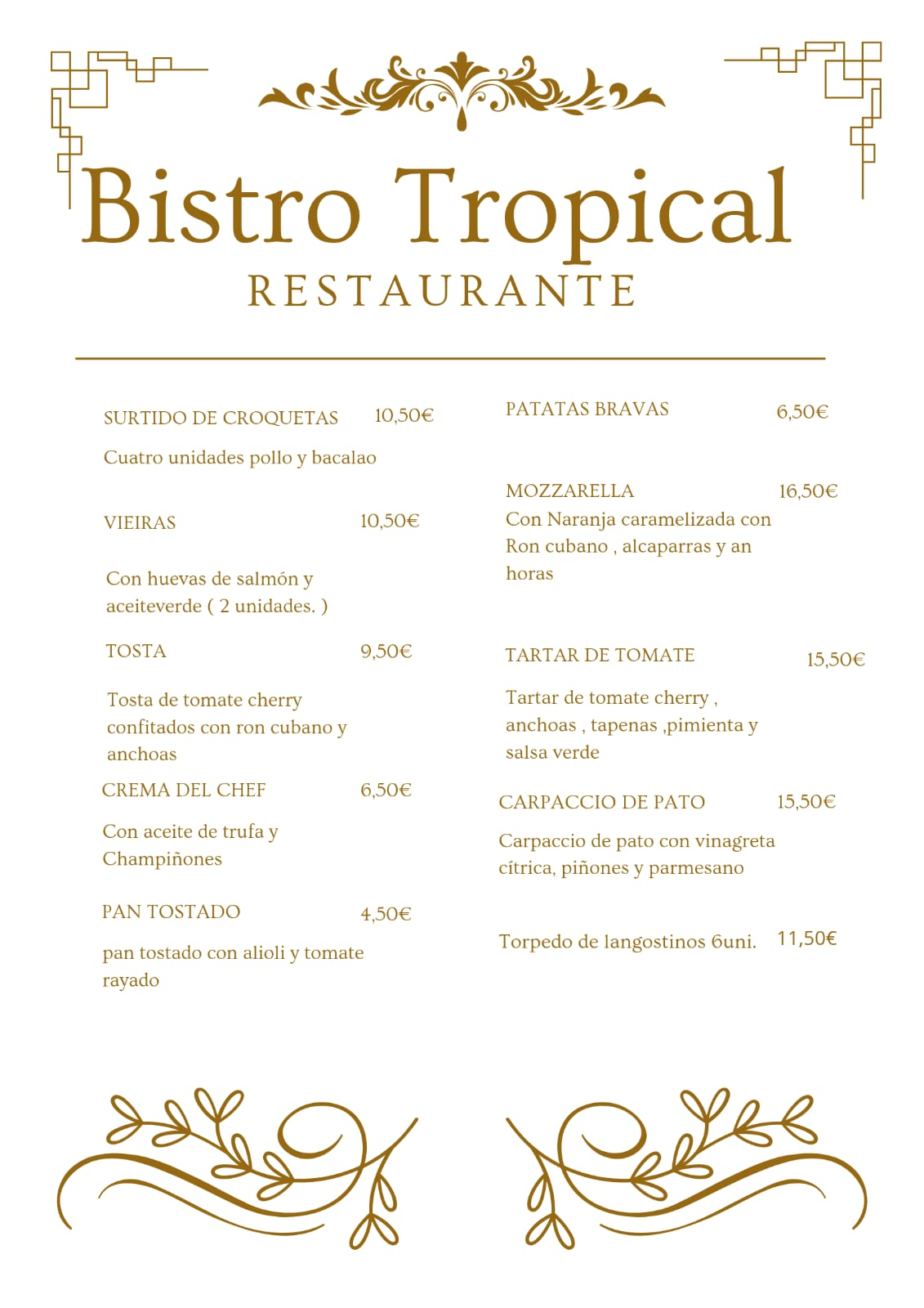 Bistro Tropical te invita a descubrir una experiencia gastronómica única donde la esencia de la cocina española se fusiona con la elegancia europea y un toque tropical.